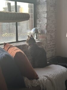 Evie: My favorite snack is pumpkin — yum! For toys, I’m obsessed with springs. And as for activities, you can usually find me sunbathing in my window bed or perched like royalty, watching all the cats stroll by downtown.